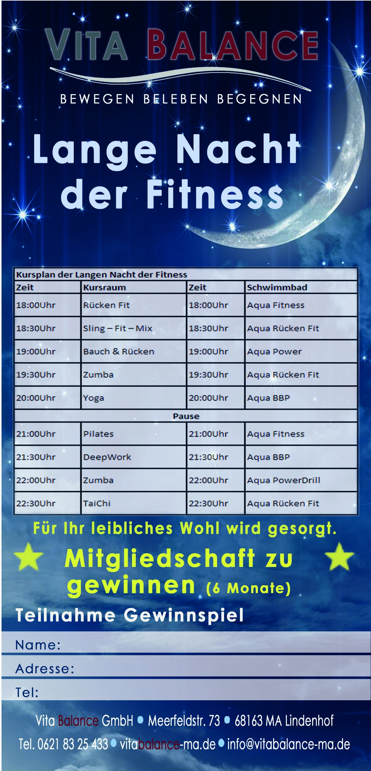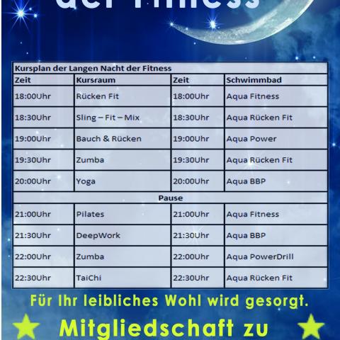 Besuchen Sie uns am 16.01.2016 bei der Langen Nacht der Fitness. Schnuppern Sie in unsere Kurse rein, machen Sie eine Kraft- oder Körperanalyse und testen Sie Ihre Ausdauer.